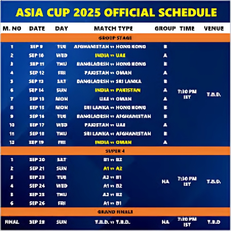 The Asia Cup 2025 schedule spans from September 9 to 28, starting with group matches. Key dates include India-Pakistan on September 14, a must-watch in Asia Cup 2025.
